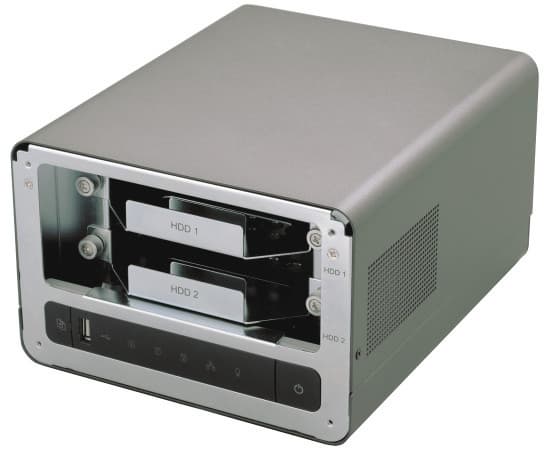 Размеры корпуса — 21,5×17,5×12 см. В глубину может дополнительно потребоваться до 3 см для подключения кабелей. Лицевая панель имеет специальное отверстие, через которое пользователь получает доступ к органам управления — кнопке питания, порту USB и кнопке копирования для него, а также индикаторам (состояние, диск 1, диск 2, сеть, питание).
