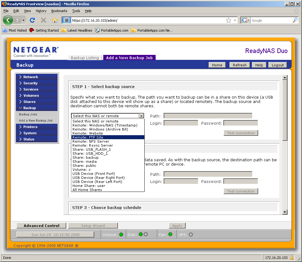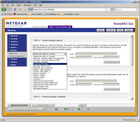 В ReadyNAS Duo встроены мощные средства резервного копирования. На первой закладке группы «Backup» можно посмотреть их список заданий и проверить логфайлы их выполнения, а на второй — непосредственно создать новое задание. Возможности по выбору источника и получателя впечатляют — в их качестве могут выступать: сетевые папки (CIFS), серверы FTP/HTTP/NFS/rsync, USB-накопители (в том числе и с выбором по порту подключения), общие папки самого NAS, домашние директории пользователей. Предусмотрено указание и проверка требуемых имен и паролей для доступа к ресурсам. Настройка времени запуска задачи включает выбор периодичности, времени и дней недели. Дополнительные опции — выбор периодичности полного бекапа, типа сообщений администратору и изменение владельца файлов после копирования. Запуск одного или нескольких заданий можно назначить на фронтальную кнопку накопителя. Пожалуй, данная реализация резервного копирования — лучшая из тех, что мы встречали в NAS. Не хватает ей только поддержки шифрования.