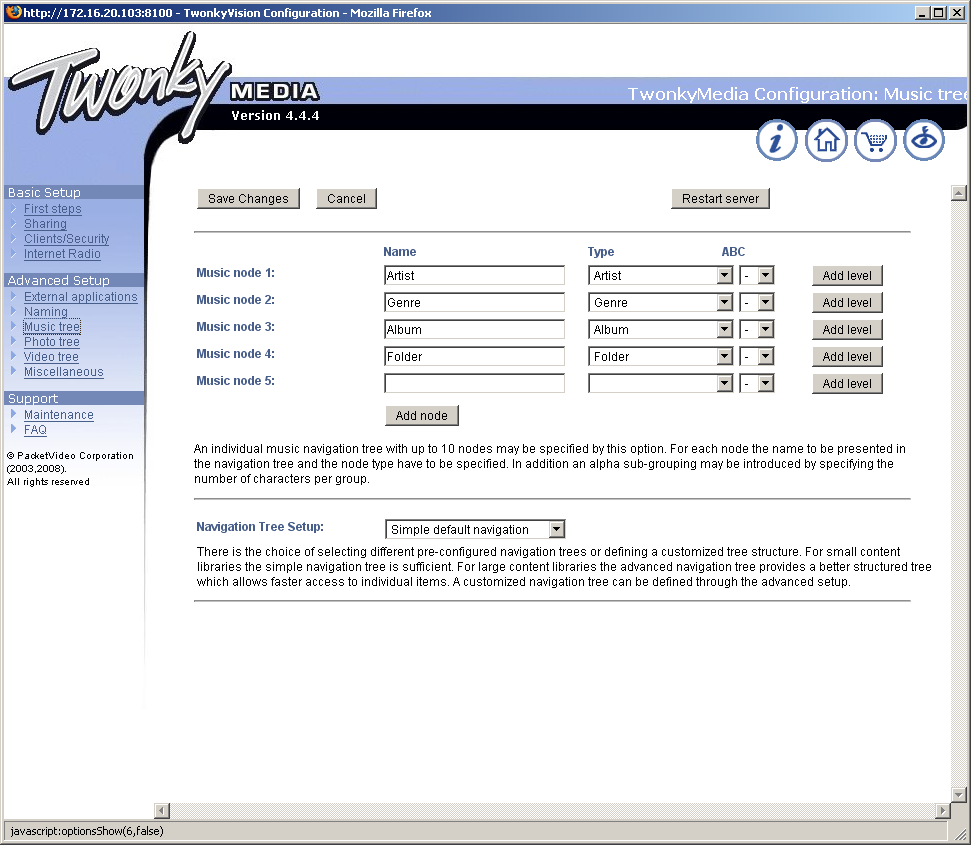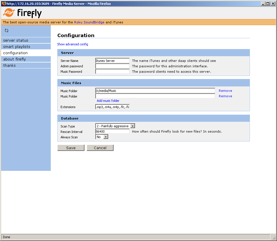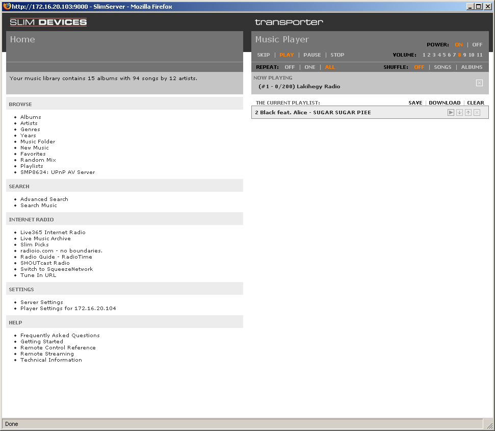 Первая из них — музыкальный сервер для устройств Squeezebox, позволяющий хранить все файлы в едином месте в сети и пользоваться ими с любого плеера. К сожалению, у нас такого плеера не было, так что проверить работу мы смогли только с программным клиентом Softsqueeze. Кроме музыкальных файлов, сервер также предоставляет доступ к интернет-радиостанциям и RSS-лентам новостей. Дополнительные настройки сервера доступны на специальной странице. Здесь можно просматривать содержимое медиабиблиотеки, составлять плейлисты, Система воспринимает русские теги в файлах wma и mp3 (только Unicode), хотя, конечно, на экране самих плееров они, скорее всего, видны не будут. Предусмотрена только одна папка для сканирования файлов. Правда, ее можно выбрать в качестве корневой директории накопителя. Предусмотрена интеграция с серверами iTunes и UPnP AV/DLNA. Поддерживается большое количество форматов звука. Плееры аппаратно поддерживают aiff, flac, mp3, ogg, wav, wma. Другие файлы конвертируются «на лету» сервером. Настроек у сервера очень много, их детальное рассмотрение выходит за рамки данной статьи. Дополнительную информацию можно найти на указанных выше сайтах.