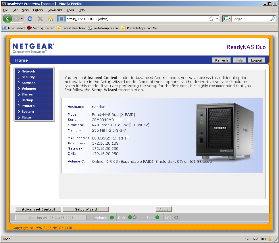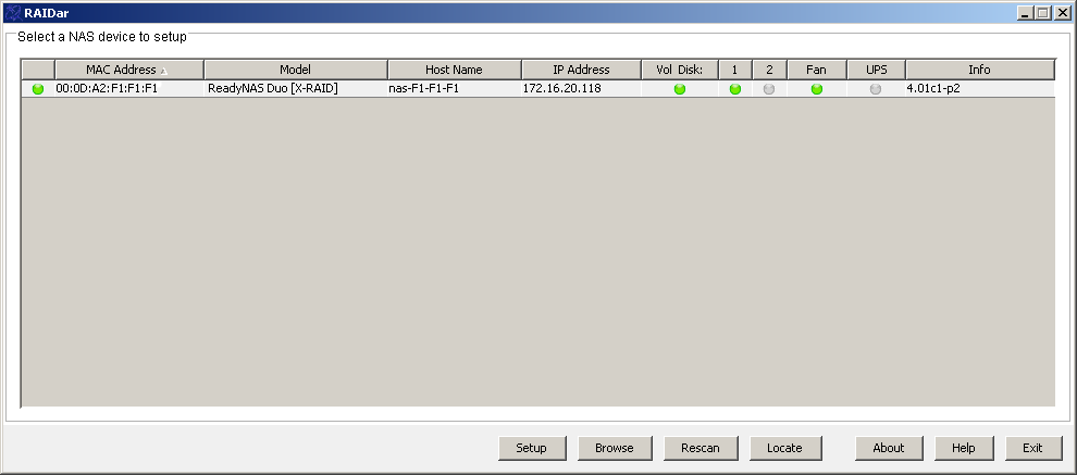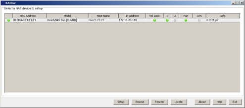 Как мы говорили в начале статьи, NETGEAR продает полностью готовые к работе устройства, так что для начала работы нужно просто подключить накопитель в локальную сеть и включить его. При желании, можно использовать программу RAIDar для поиска накопителя в сети. В ней отображается MAC-адрес, модель, сетевое имя, IP-адрес, состояние дисков и вентилятора, версия прошивки. Специальные кнопки позволяют вызвать браузер для настройки NAS и для доступа к содержимому общих папок. Если используется несколько одинаковых накопителей в сети, то можно для обнаружения нужного включить специальный режим мигания его светодиодов. Однако возможности RAIDar, на наш взгляд, в некоторых ситуациях недостаточны. Несмотря на то, что она может обнаружить устройство в сети, даже если его адрес не принадлежит использованному на компьютере диапазону, поменять его она не в силах.