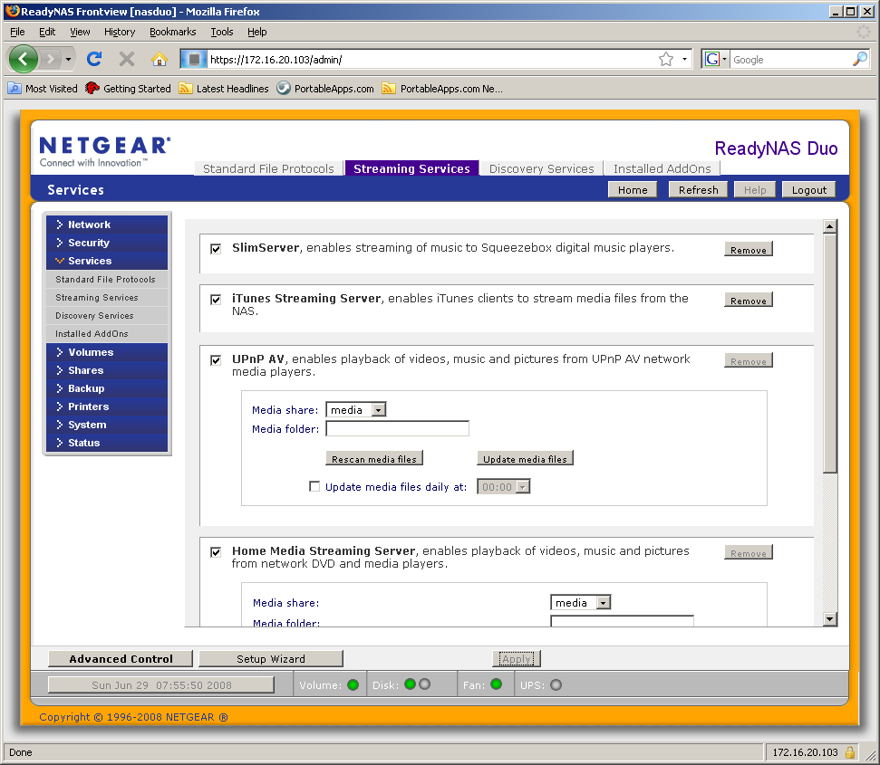 Вторая часть данной группы — сервисы потокового вещания. NAS поддерживает SlimServer (сервер музыкальных файлов для устройств Squeezebox), iTunes, UPnP AV и Home Media Streaming Server (для сетевых плееров на платформе Syabas). О них будет рассказано далее в статье.