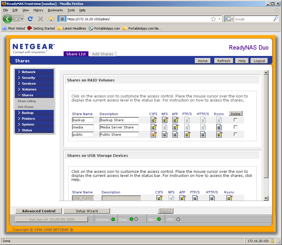 Группа «Volumes» состоит из двух страниц. На первой можно посмотреть состояние дисков и массива, запустить синхронизацию. Вторая посвящена USB-устройствам — можно посмотреть, что подключено, какие файловые системы используются. При необходимости, диски форматируются в FAT32 или ext3 прямо из Web-интерфейса. Если у вас есть цифровой фотоаппарат, то возможно, полезной будет функция автоматического копирования всех файлов с USB-носителя при подключении (можно выбрать общую папку и директорию в ней). Если вы часто пользуетесь одним и тем же накопителем, то можно присвоить ему определенное имя. В этом случае при любом последующем включении он будет доступен под ним по сети. К сожалению, установленные права сетевого доступа не сохраняются при переподключении.