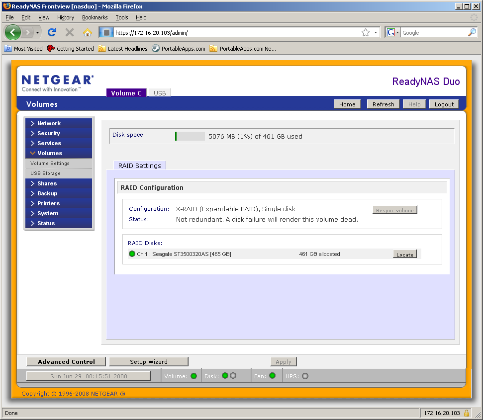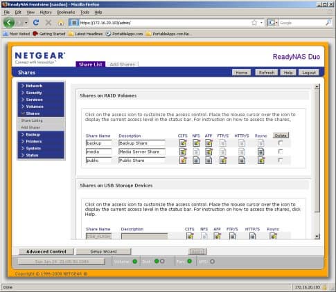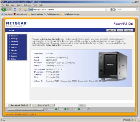 Особенность конфигурации ReadyNAS Duo в том, что используется специальный фирменный режим X-RAID. В этом случае установка второго диска повышает только надежность накопителя (организуется аналогичный RAID1 массив-зеркало), но не общий объем или скорость. Потенциальным покупателям обязательно нужно обратить на это внимание. Второе следствие данного решения — повышенная сложность получения доступа к данным в случае выхода из строя самого накопителя. Если у других NAS можно просто подключить диск к системе с Linux, то здесь используется LVM и ext3 с большим размером блока, так что для «открытия» диска потребуются соответствующие профессиональные навыки.