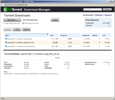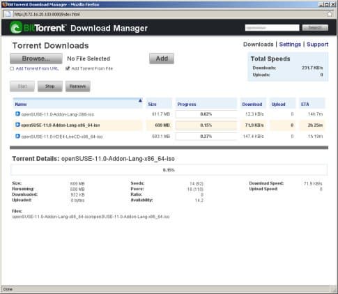 Актуальный для многих пользователей клиент BitTorrent представлен в накопителе в оригинальном варианте — даже на коробке стоит логотип BitTorrent. Само программное обеспечение является в данном случае дополнительным модулем для штатной прошивки. Поэтому и настраивается в двух местах — в главном Web-интерфейсе администрирования можно включить модуль и выбрать для него общую папку и директорию в ней, куда будут записываться файлы. Также выбирается и пользователь, от имени которого работает программа. Настройки собственно клиента делаются уже в его личном Web-интерфейсе. Среди них — выбор порта, максимальных скоростей работы, правила раздачи. Под последним понимается выбор между — раздавать пока пользователь не удалит, раздавать пока рейтинг файла не достигнет заданного значения или раздавать указанное число минут после окончания загрузки.