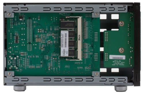 Если снять боковые панели — можно увидеть внутреннее устройство накопителя. Он собран на трех печатных платах — основной, с разъемами SATA и фронтальными органами управления. На главной плате доступен разъем с модулем памяти SODIMM. Его можно поменять на больший по объему самому пользователю.