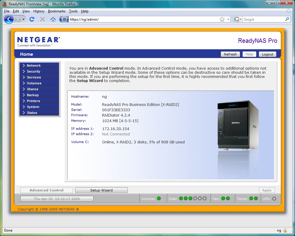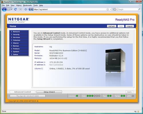На начальном окне можно узнать основные системные параметры устройства — сетевое имя, модель, серийный номер, версию прошивки, объем памяти, сетевые адреса интерфейсов, общий и свободный объем томов. Можно и потом вернуться на эту страничку по кнопке «Home». Здесь же можно воспользоваться настройкой в режиме помощника.