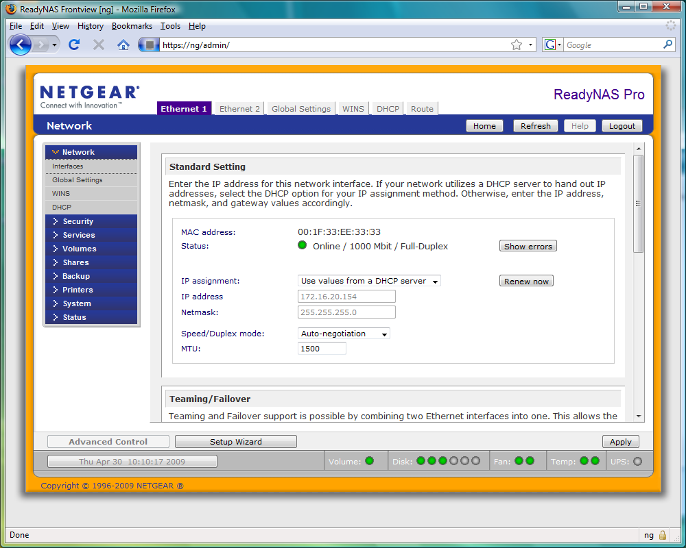 Начинается все с сетевых настроек. Кроме указания для каждого интерфейса привычных параметров, есть и редко встречающиеся настройки. В частности выбор режима одновременной работы двух контроллеров (Teaming/Failover), установка VLAN ID для каждого из них и включение Jumbo (один фиксированный размер — 9000 байт). Также есть пункты по настройке имени хоста, адреса маршрутизатора по-умолчанию, серверов DNS и WINS (сервером WINS может работать и сам накопитель). Поддерживается работа в качестве DHCP-клиента и сервера. Дополнительно есть возможность добавления пользовательских данных в таблицу маршрутизации сервера.