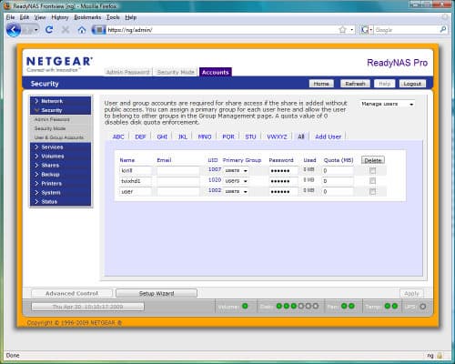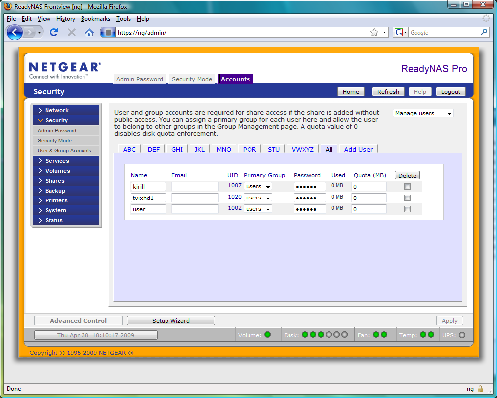 Вторая группа — работа с учетными записями и группами. Накопитель может быть включен в состав домена Windows или же работать в составе рабочей группы. Во втором случае необходимо запрограммировать всех пользователей, которым требуется доступ к серверу. Настроек здесь больше обычного — можно указать UID/GID, основную группу, e-mail, квоты и другие данные. Более интересно то, что предусмотрена возможность импорта и экспорта данных пользователей через текстовые файлы, что может быть удобно в организациях с несколькими накопителями и большим числом пользователей при отсутствии домена. Интересно организован алгоритм восстановления пароля администратора — отправка нового на указанный ранее e-mail при условии правильного ответа на секретный вопрос. Работа функции требует работающего Интернет-соединения или определенных настроек локальной сети.