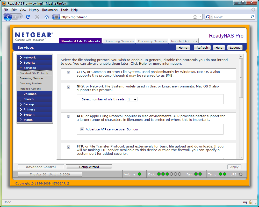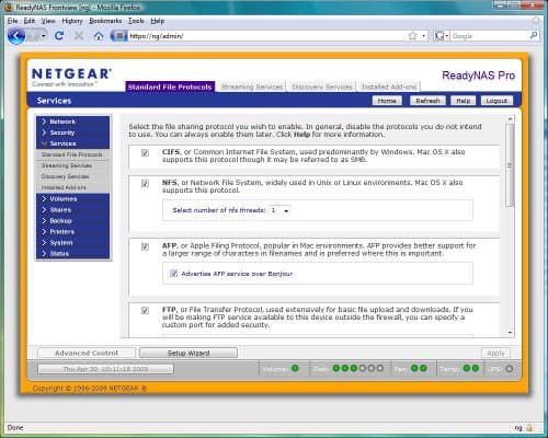 Следом идут настройки поддерживаемых сетевых протоколов. На первой странице можно индивидуально активировать протоколы CIFS, NFS, AFP, FTP, HTTP/HTTPS и Rsync. Для FTP есть все основные настройки — порт, порты для пассивного режима, стандартный/анонимный режим. Русские буквы поддерживаются при использовании Unicode-клиентов. Работает и подключение с шифрованием (FTPES). Богато представлены и сервисы потокового вещания — SqueezeCenter для аудиоустройств Slimdevices, iTunes для поклонников продукции Apple, UPnP AV для Sony PS3 и различных NTM-плееров, Home Media Streaming Server для продуктов на базе прошивок Syabas и аналогичных.