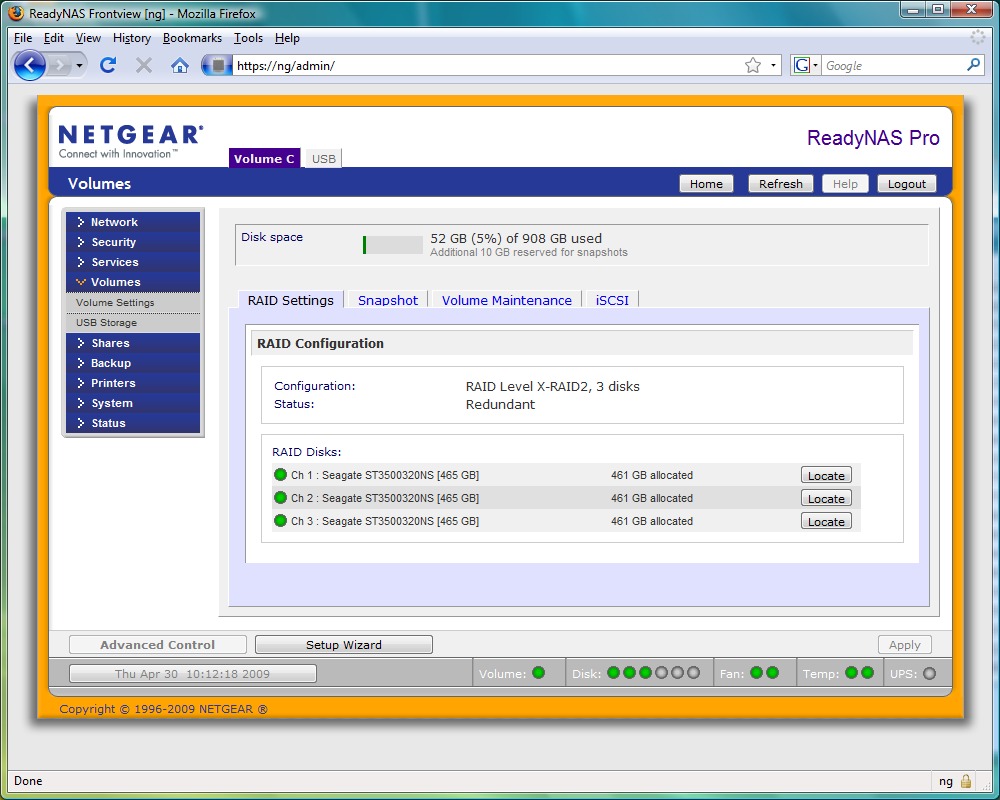 Накопитель настраивается через привычный Web-интерфейс. Поскольку есть дисплей, в том числе отображающий и текущий IP-адрес, использование комплектной улититы RAIDar не обязательно. Однако только с ее помощью можно осуществить изменение режима X-RAID2 на FlexRAID и обратно. Это требует полного сброса настроек и конечно сопряжено с потерей всех данных. Так что желательно серьезно подумать перед началом эксплуатации о выборе более удобной для вас конфигурации. Основные отличия заключаются в том, что X-RAID2 можно наращивать постепенно добавляя диски. Потери информации при этом не происходит. А FlexRAID позволяет выбирать любой из стандартных режимов работы массива, например RAID0, RAID5 или RAID6.
