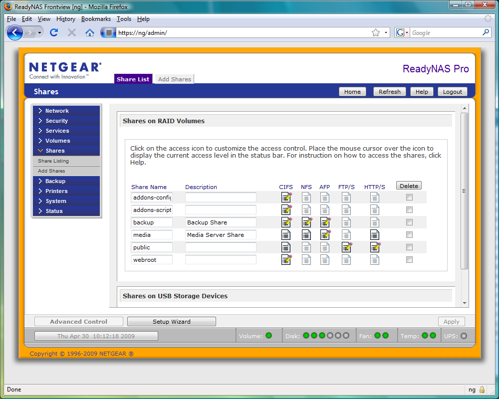 Общих директорий может быть сколько угодно. Вводить их на соответствующей странице можно сразу по пять. Кроме имени указывается и описание. Настройка прав доступа оформлена не очень привычным способом, однако вполне функциональна. Для CIFS задаются — доступ по умолчанию, список допущенных хостов, список пользователей и групп с доступом «только для чтения», список пользователей и групп с полным доступом, гостевой доступ, скрытие папки в сетевом окружении, включение корзины для удаленных файлов (с указанием максимального объема и времени хранения), дополнительные права и oplocks. Аналогичным образом настраивается доступ по NFS, AFP и HTTP/HTTPS. Несмотря на оригинальный алгоритм установки прав, пользоваться им достаточно удобно.