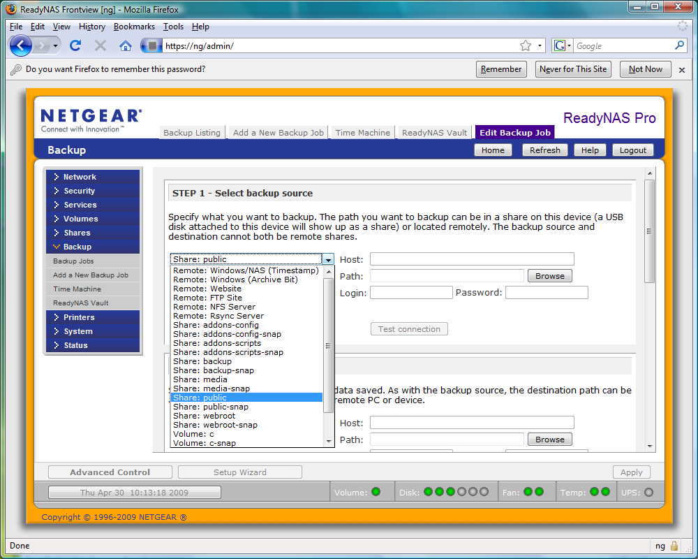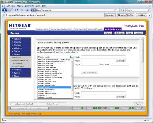 В отличие от большинства аналогичных устройств, встроенные возможности ReadyNAS Pro по резервному копированию поистине безграничны — устройство в автономном режиме может делать резервные копии с участием удаленных и встроенных ресурсов, среди которых обычные сетевые папки Windows, сервера FTP/NFS/Web/Rsync, USB-накопители и внутренние директории. Единственное ограничение — источник и/или назначение должны быть локальными. При этом поддерживается расписание работы и различные режимы создания копий.
