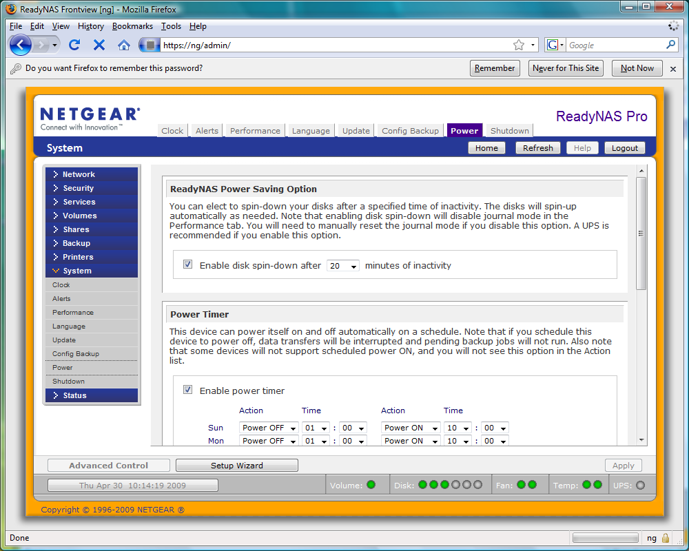 Предпоследняя группа собрала в себе различные системные настройки. В частности — установку часов, выбор адресов и параметров почтового сервера для отправки сообщений, несколько специальных настроек параметров производительности, языковые параметры, сохранение/восстановление/сброс настроек, обновление прошивки и установка плагинов, управление питанием (включая расписание с двумя действиями на каждый день недели), выключение и перезагрузка сервера. Отметим здесь поддержку функции включения по сети (WOL) и выбор интервала отключения внутренних дисков при бездействии.