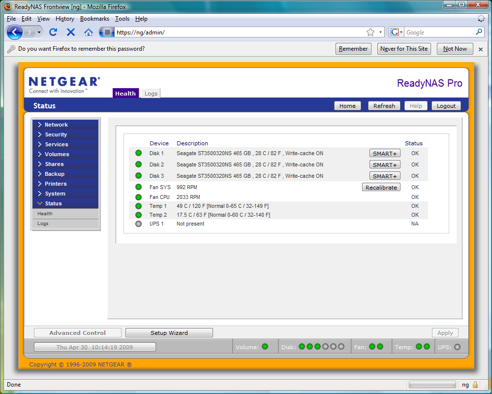 Основное окно имеет фиксированный размер и как раз умещается на экране с популярным сегодня в ноутбуках разрешении 1280 на 800 точек. Оно достаточно информативно — в нижней части рамки присутствуют динамические индикаторы состояния тома, дисков, вентиляторов, температуры и источника бесперебойного питания, а также дата и время.