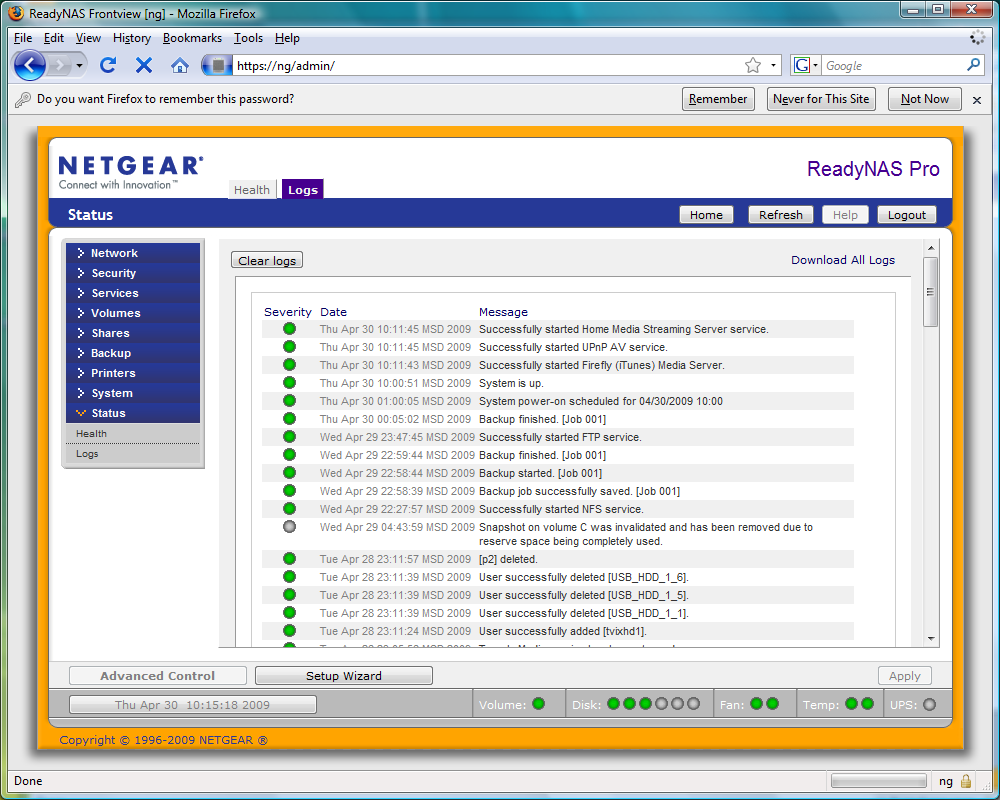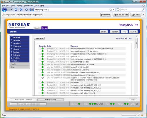 Ну и последние две страницы — статус аппаратных датчиков системы (состояние дисков, температуры, скорости вентиляторов) и список событий. Список достаточно подробный, однако нельзя узнать текущие подключения и точные действия пользователей FTP, как у некоторых новых моделей NAS от других производителей.