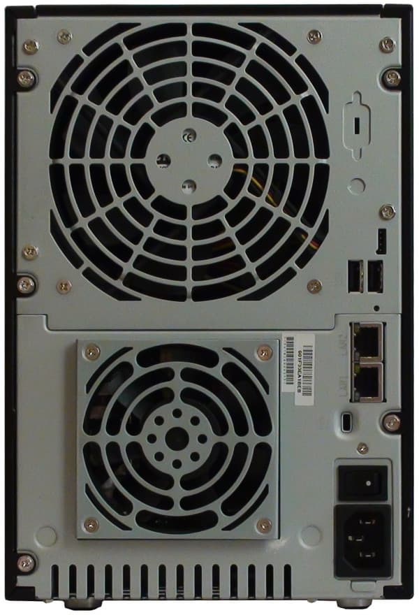 Основной цвет оформления — черный, с небольшой примесью металика на передней панели. Сама она изготовлена из пластика и металлической решетки. Остальные стороны — также металлические. На левой боковой есть решетка вентилятора процессора, это первая модель с активным охлаждением чипа, которую мы встретили. Возможно, это свидетельствует о высокой производительности — проверим в тестах. Сзади можно увидеть еще два вентилятора — 120 мм для дисков и 80 мм для блока питания. Шум от них относительно небольшой, даже при значительной нагрузке. Однако совсем тихой модель назвать нельзя — все-таки шесть винчестеров тоже играют свою роль. В спальне устанавливать накопитель не рекомендуется, однако в обычной офисной обстановке он не будет выделяться по этому параметру. Упомянем здесь и возможность отключения дисков в случае отсутствия активности, что улучшает данный показатель. В любом случае, баланс между производительностью и уровнем шума, на наш взгляд, вполне достойный.
