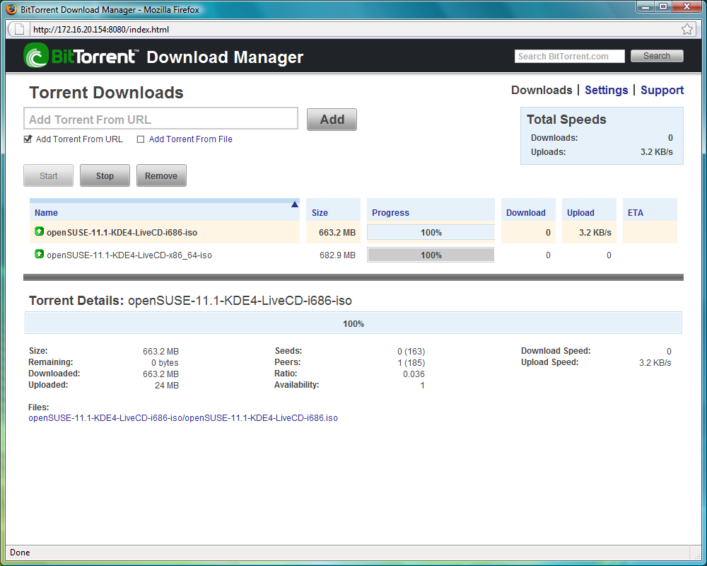 Первым конечно стоит упомянуть клиент для загрузки torrent-файлов. Он представлен в оригинальном виде — от самой BitTorrent. Клиент удобный и функциональный. Позволяет выбрать порт, ограничить скорости, установить критерий завершения работы с файлом (по времени или по рейтингу). Файлы закачиваются в выбранную директорию одной из общих папок. Недостает, пожалуй, только выбора расписания работы. Пользователям, которые хотят управлять заданиями удаленно, придется пробросить еще один порт на роутере для доступа к интерфейсу клиента. Вот только еще одна проблема останется — он никак не защищен и воспользоваться им сможет любой пользователь сети.