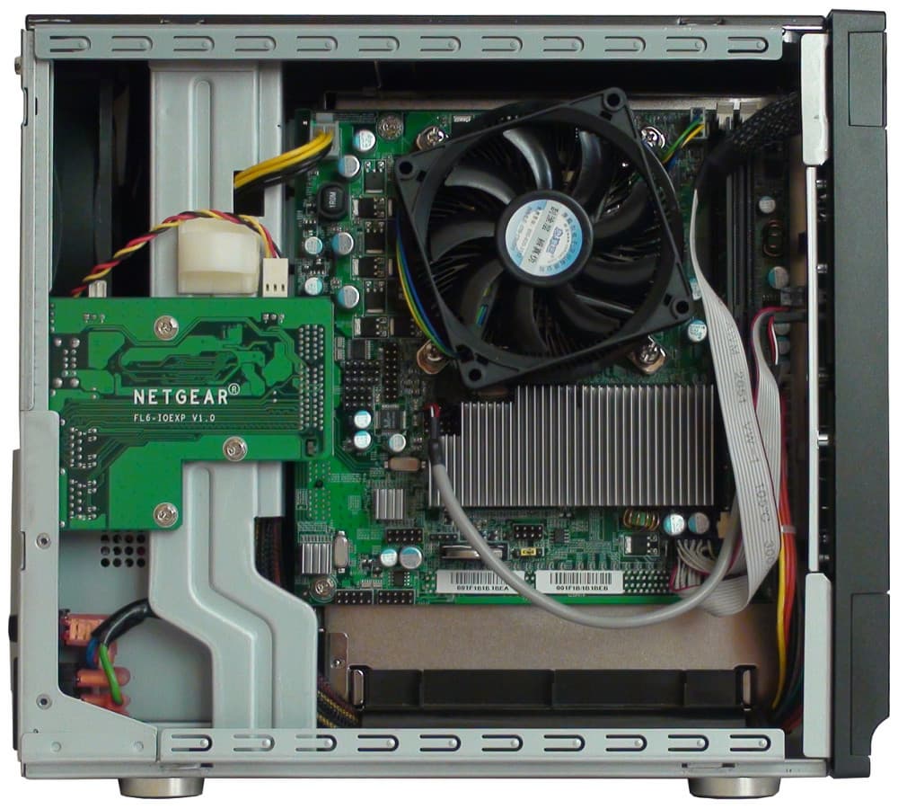 Основная плата — оригинального дизайна, но очень похожа на miniITX. На ней находится процессор Intel E2160 в сокете LGA775, чипсет Q965+ICH8 с общим радиатором, 1 ГБ оперативной памяти в стандартном модуле DIMM DDR2-667 (всего слотов два, второй пустует), звуковой чип Realtek ALC883, пара сетевых контроллеров Marvell 88E8053 для шины PCIe (с небольшими радиаторами). Также присутствует множество привычных по платам для 486-х процессоров коннекторов. В частности можно найти порты с подписями VGA, AUDIO и COM2. Так что при желании можно использовать данную модель просто как персональный компьютер. По конфигурации становится понятно, почему нет дополнительных портов eSATA — устройство использует все шесть чипсетных, так что свободных просто не остается.