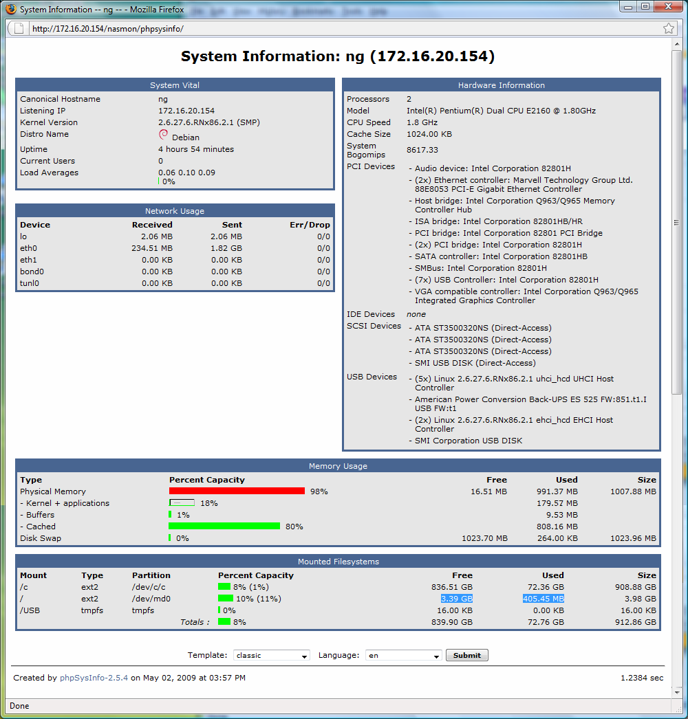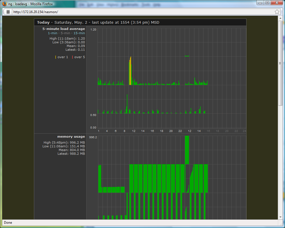 Посмотреть чуть больше информации о состоянии сетевого накопителя можно с помощью программы Nas Monitor. В ее составе три модуля, которые показывают через браузер такие параметры как загрузка процессора, памяти, сетевого интерфейса, вывода команд top/netstat/pstree/vnstat, а также PHPSysInfo.