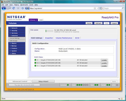 Технология X-RAID2 имеет очень полезную особенность — постепенное наращивание объема массива установкой новых дисков или заменой уже установленных более емкими. При этом система автоматически без вмешательства пользователя и без потери данных проводит переконфигурацию. С тестовыми дисками по 500 ГБ каждый шаг по добавлению винчестера занимал около 10 часов. При этом его нельзя было прервать или отложить (формально вторая модификация фирменной технологии устойчива к потере питания во время расширения, но проверять мы это не стали, UPS однозначно должен использоваться, если вам дороги данные). Этот момент стоит учесть при планировании расширения. В момент создания массива можно выбрать режим, который допускает отказ не одного, а двух винчестеров. Конечно это сопровождается уменьшением доступного полезного объема накопителя.