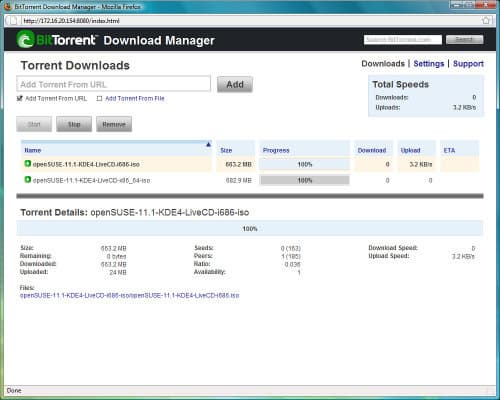 В качестве альтернативы можно использовать популярную программу Transmission. Она работает также со своим Web-интерфейсом или с удаленными управляющими модулями (например Transmission Remote). В некоторых случаях она может быть более интересна (загрузка выборочных файлов из торрента, авторизация пользователя и т. п.).