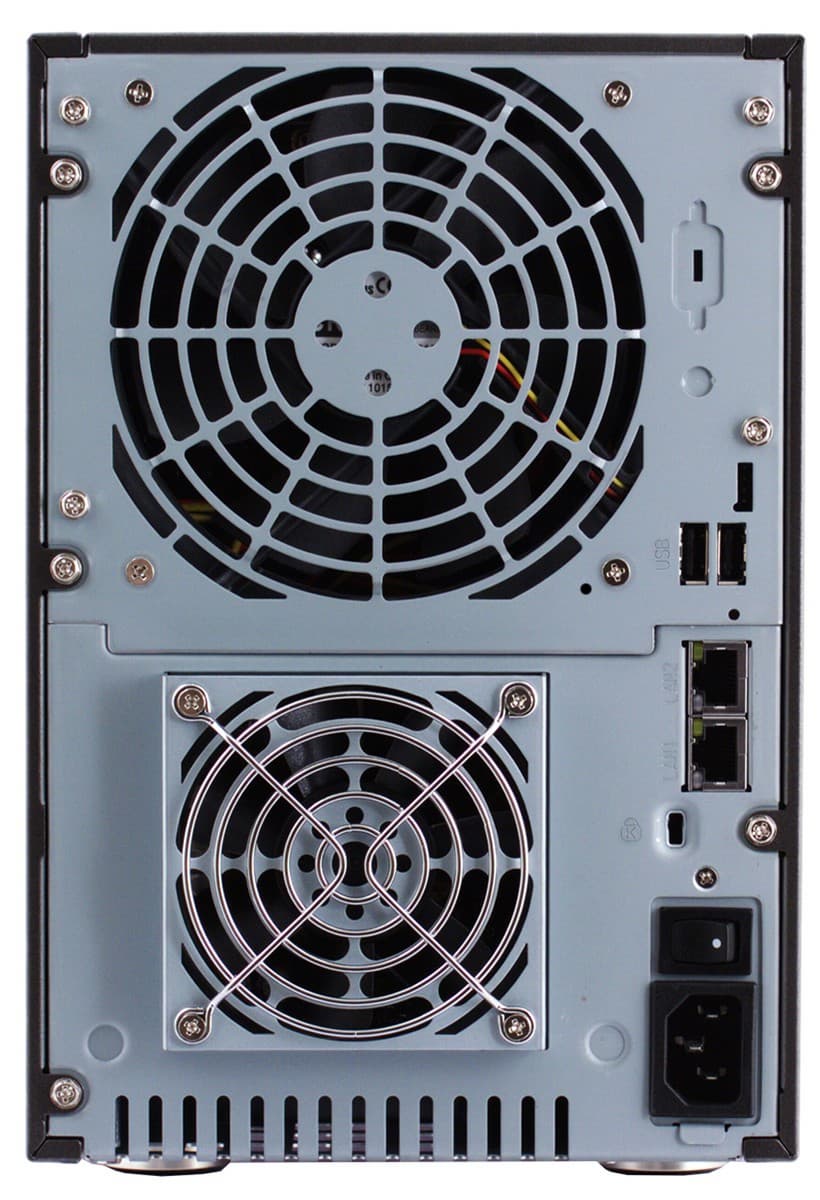 Сзади больше всего пространства занимают два вентилятора — 12-сантиметровый для винчестеров и 8-сантиметровый для блока питания. Первый забирает воздух через переднюю панель, а второй — через решетку на дне устройства. Так что желательно не ставить устройство в пыльном месте — для очистки вентилятора в блоке питания придется полностью разбирать накопитель.