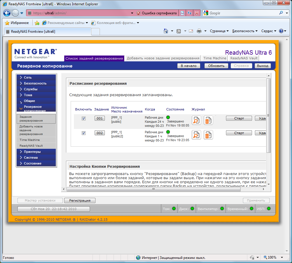 Как мы уже неоднократно говорили, встроенная система резервного копирования в устройствах ReadyNAS является одной из наиболее функциональных. Она позволяет работать с локальными папками, внешними устройствами, сетевыми ресурсами по различным протоколам, включая FTP. Задания могут работать в ручном режиме или же по расписанию. При желании любое количество задач можно привязать к кнопке на передней панели накопителя.