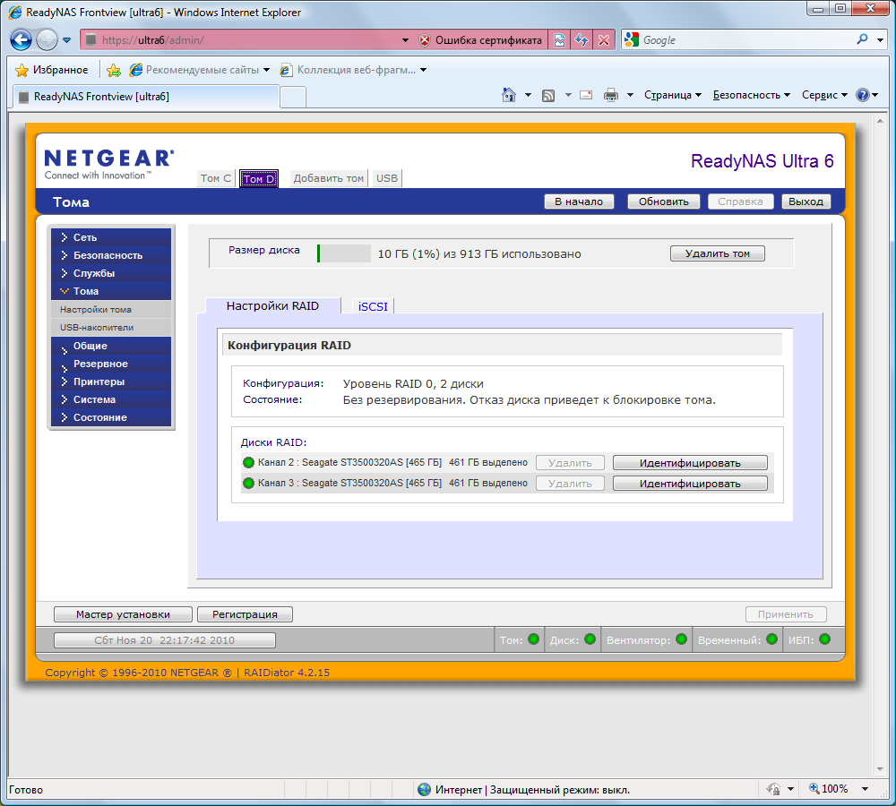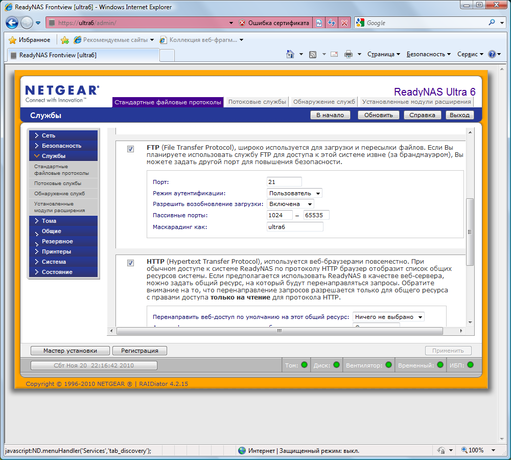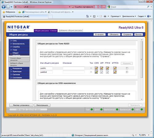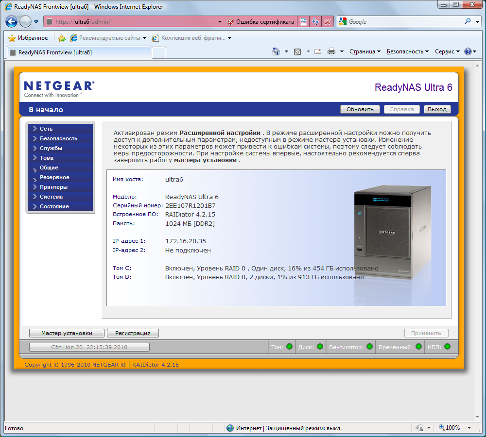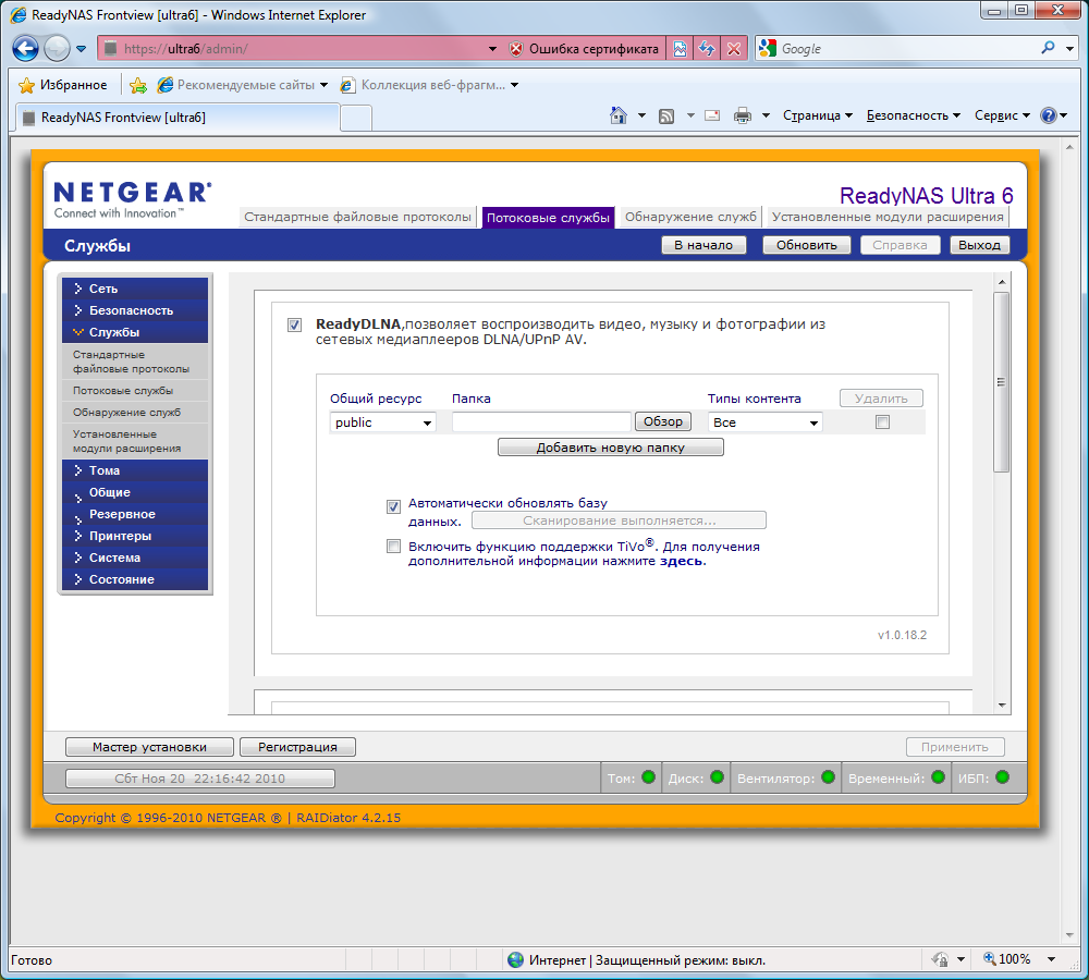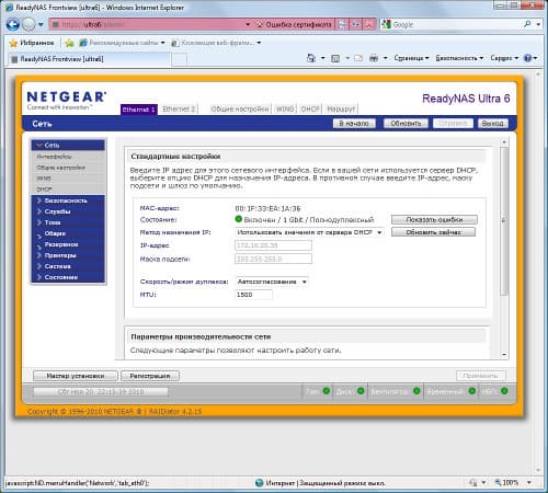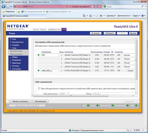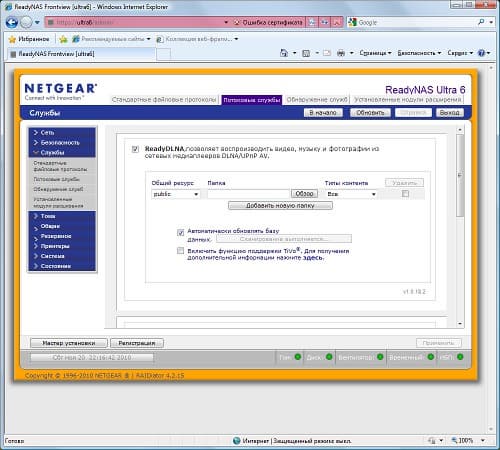 Еще одной особенностью ReadyNAS является доступ к интерфейсу настройки не просто по IP-адресу/имени хоста, а с добавлением суффикса /admin/. Кроме того, происходит автоматическая переадресация на HTTPS. Собственный сертификат SSL загрузить в устройство нельзя. Для домашнего применения это, конечно, не критично. Интерфейс локализован, язык определяется по настройкам браузера. Для начинающих пользователей есть режим помощника.