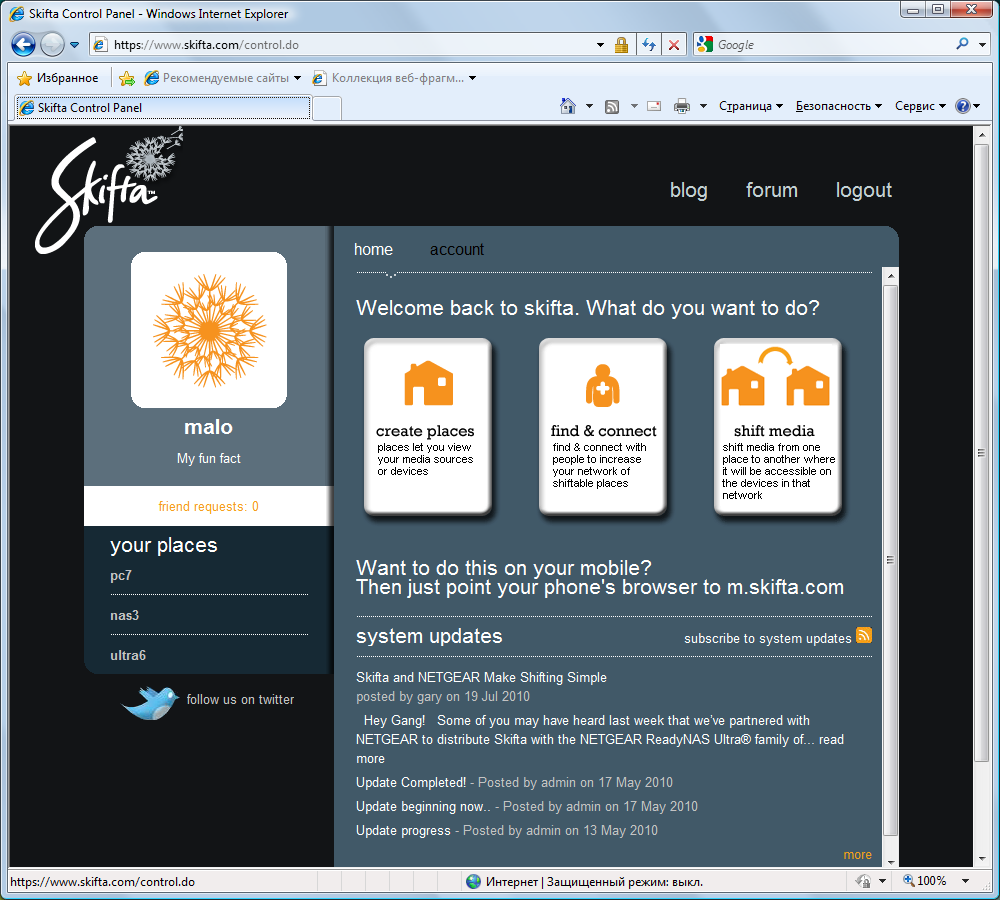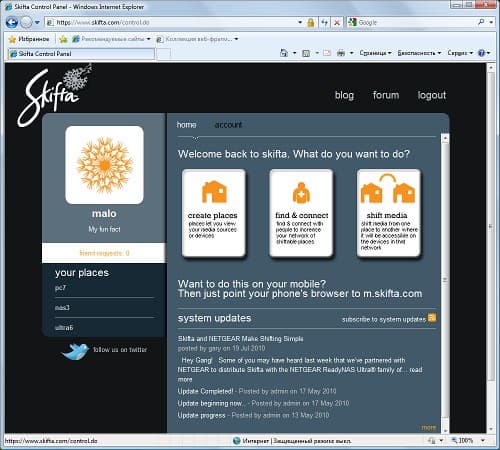 Еще одна программа, которая позволяет расширить варианты использования мультимедиа — сервис Skifta. Как и в прошлый раз, понять смысл и способ ее работы оказалось непросто. Сначала необходимо разобраться с концепцией «место». Под ним подразумевается не одна медиабиблиотека на одном устройстве, а общее связанное локальной сетью пространство. Например, квартира, в которой есть ПК, ноутбук, NAS, роутер и, конечно, доступ в интернет. Достаточно иметь Skifta на одном из устройств (есть версии для ПК под разные ОС) и поддержку DLNA на всех остальных. При этом само программное обеспечение Skifta не является медиасервером.
