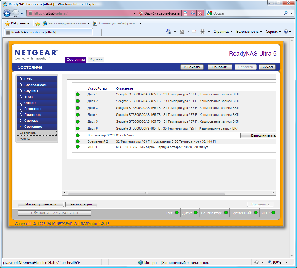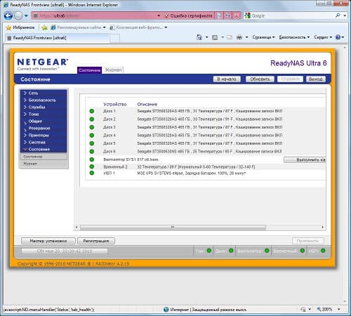 Заканчивая этот раздел, упомянем про страницу состояния сервера, на которой можно увидеть статус винчестеров, вентилятора, температуру системы, данные ИБП. Для винчестеров предусмотрено предоставление детальной информации SMART. Аналогичные по смыслу индикаторы постоянно присутствуют в нижней строке web-интерфейса и также доступны через RAIDar.