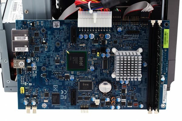 Основная печатная плата, размером почти во всю боковую стенку, несет на себе процессор D510 с двумя ядрами и частотой 1,67 ГГц, закрытый достаточно крупным алюминиевым радиатором. Функции южного моста выполняет чипсет NH82801IR. Оперативная память — модули стандартного формата DIMM, всего предусмотрено два слота, один из которых занят планкой 1 ГБ DDR2-667. Сетевые контроллеры — пара Marvell 88E8057. Кроме классического BIOS, система использует специальный флеш-модуль на 128 МБ, подключенный через USB-контроллер, для хранения образа прошивки.