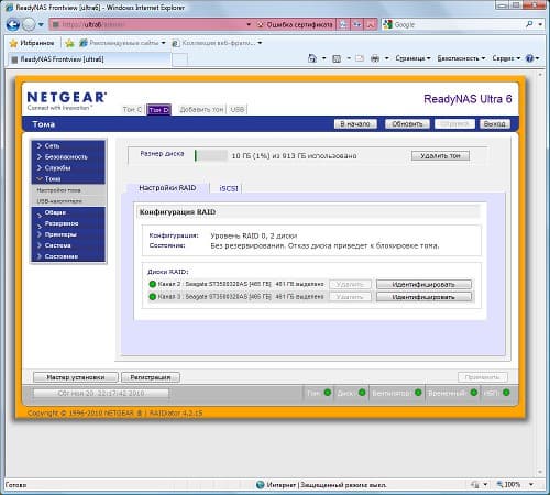 В целом интерфейс достаточно удобен, хотя иногда встречаются не очевидные тонкости, как, например, отказ в удалении или создании тома. Догадаться, что система в этот момент проводит внутренние проверки массива и поэтому не может с ними ничего сделать, достаточно сложно.
