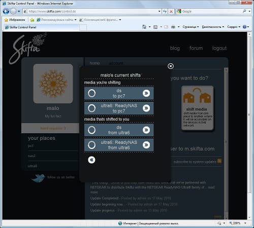 Разберем на примере. Дома у вас есть NAS, на котором активен ReadyDLNA и установлена Skifta. Есть еще другой медиасервер, скажем, в сетевом плеере. В настройках Skifta на NAS вы называете все это «место 1». На ноутбук устанавливается Skifta и обзывается «место 2». Можно взять ноутбук с собой в гости. Там подключить к местной сети (которая должна иметь доступ к интернету), настроить «перемещение» медиафайлов с одного из двух медиасерверов, находящихся в «место 1», на «место 2». Тогда любой медиаплеер, находящийся в гостевой сети, увидит появление нового DLNA-сервера и сможет проиграть с него файлы.
