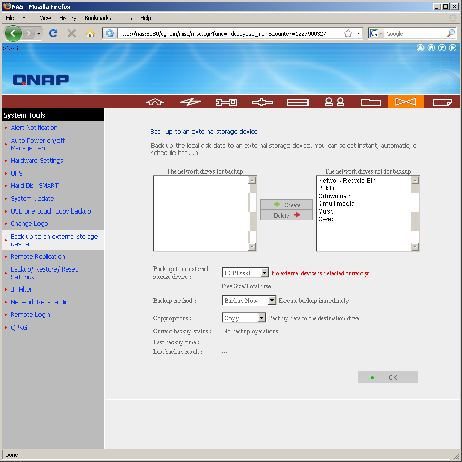На передней панели устройства около порта USB есть отдельная кнопка, которая может использоваться для быстрого копирования данных с подключенной флешки в одну из папок на жестких дисках. При этом можно выбрать несколько вариантов записи — копирование в новую созданную папку, копирование в папку или синхронизация. Также можно реализовать и противоположное действие — запись на USB-накопитель содержимого одной из общих папок, например для целей резервного копирования.