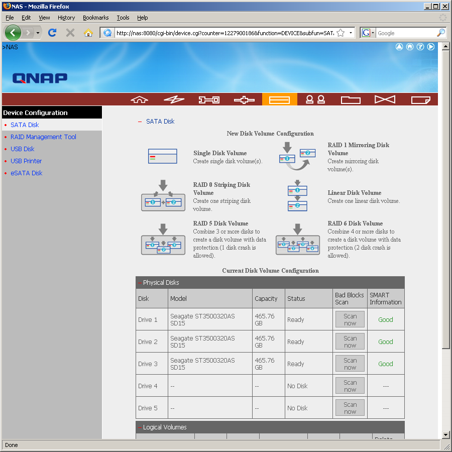 Четвертая по порядку, но не по значимости, группа отвечает за настройку дисковых массивов. Первая задача на данной странице — создание массивов. Можно выбрать любые свободные диски и сделать из них новый том форматов RAID0, 1, 5 или 6. Также возможно использование одиночных дисков и линейных томов. В этот момент для RAID5 можно задать диск для автоматического восстановления при отказе одного из винчестеров. Предусмотрены дополнительные операции с дисками и томами — сканирование дисков на плохие блоки и проверка логической структуры томов.