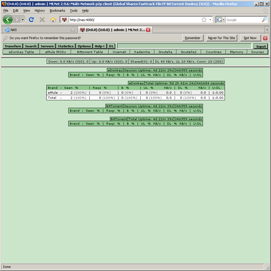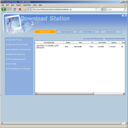 Штатный клиент загрузки файлов работает по протоколам FTP/HTTP/BitTorrent. Управлять им можно с использованием Web-интерфейса или же программы QGet. Отметим, что для этого требуется использовать имя и пароль администратора. В целом для сервиса можно задать только максимальное число активных задач (в тестируемой прошивке — до 10, что несколько странно для системы подобной производительности). А подробной настройке поддается только клиент BitTorrent. В частности можно выбрать диапазон портов, скорости загрузки и отдачи, перенаправление портов через UPnP NAT-роутер, включить шифрование, ограничить время работы сервиса (один диапазон на все дни). Для каждой задачи отдельно можно выбрать поддержку DHT, поменять приоритет, указать время раздачи после загрузки. Движение очереди происходит после окончания одного из заданий. При этом попавшая в «Finished List» загрузка остается там до удаления. Если задачу удалить, но оставить сам скаченный файл, то можно поставить эту задачу снова на раздачу, загрузив еще раз соответствующий торрент.