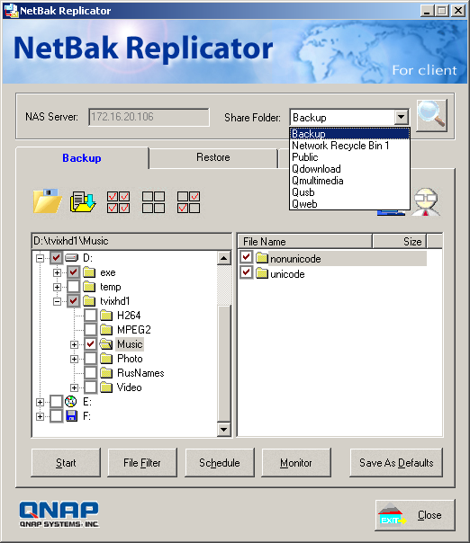 Кроме Finder, пользователи Windows могут использовать еще две комплектные программы — NetBak Replicator и Qget. Первая используется для резервного копирования данных на сетевой накопитель. Предусмотрено расписание работы для нескольких задач и режим мониторинга. Последний интересен тем, что автоматически делает копии новых или изменившихся файлов и папок. Из режимов копирования предусмотрена только простая синхронизация, так что для каждой директории хранится только одна резервная копия.