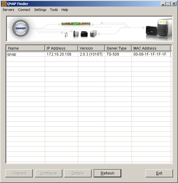 Поскольку есть возможность посмотреть имя сервера и его IP-адрес прямо на встроенном экране, то отдельная программа для поиска сервера в сети не является обязательной. Однако QNAP Finder предоставляет еще несколько полезных функций — просмотр информации о NAS (включая версию прошивки и модели дисков), установка IP-адреса и часов, перезагрузка и выключение, включение по сети (Wake On LAN), обновление прошивки. Программу можно запускать и без установки на компьютер, что очень удобно.