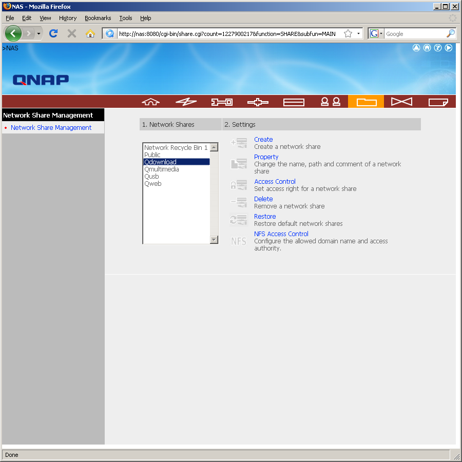 Настройка общих папок также не принесла сюрпризов — создать, удалить, переименовать (только не системные папки), настроить права. Для каждой папки можно отдельно выбрать режим oplocks и скрытие из браузера сети. Отдельным пунктом идет настройка доступа по NFS. В данном случае выбирается тип (нет доступа, только чтение, полный доступ) и адреса, которым это доступно. Проверка с NMT-плеером и DViCO TViX показала, что данная функция работает корректно.
