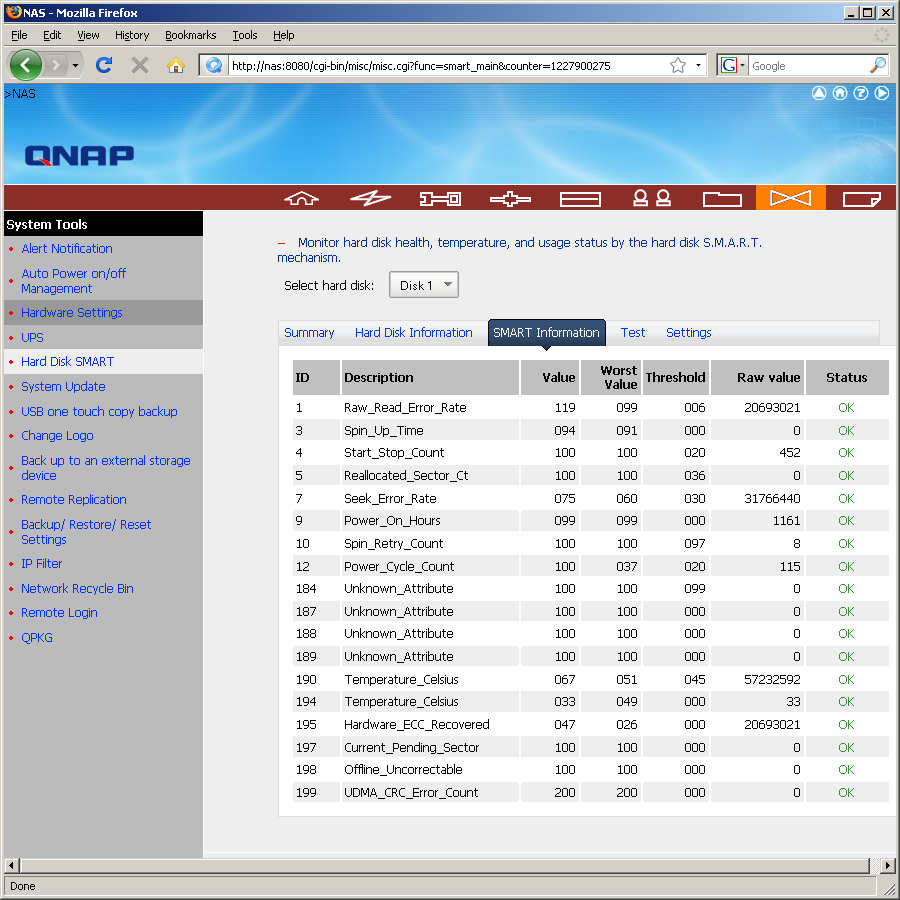 Общий внешний вид окон Web-интерфейса уже знаком нам по обзору системы видеонаблюдения от Qnap — строка иконок групп в верхней части, меню текущей страницы справа и собственно сами пункты настроек в центре. Рассмотрим подробно все параметры настроек накопителя.