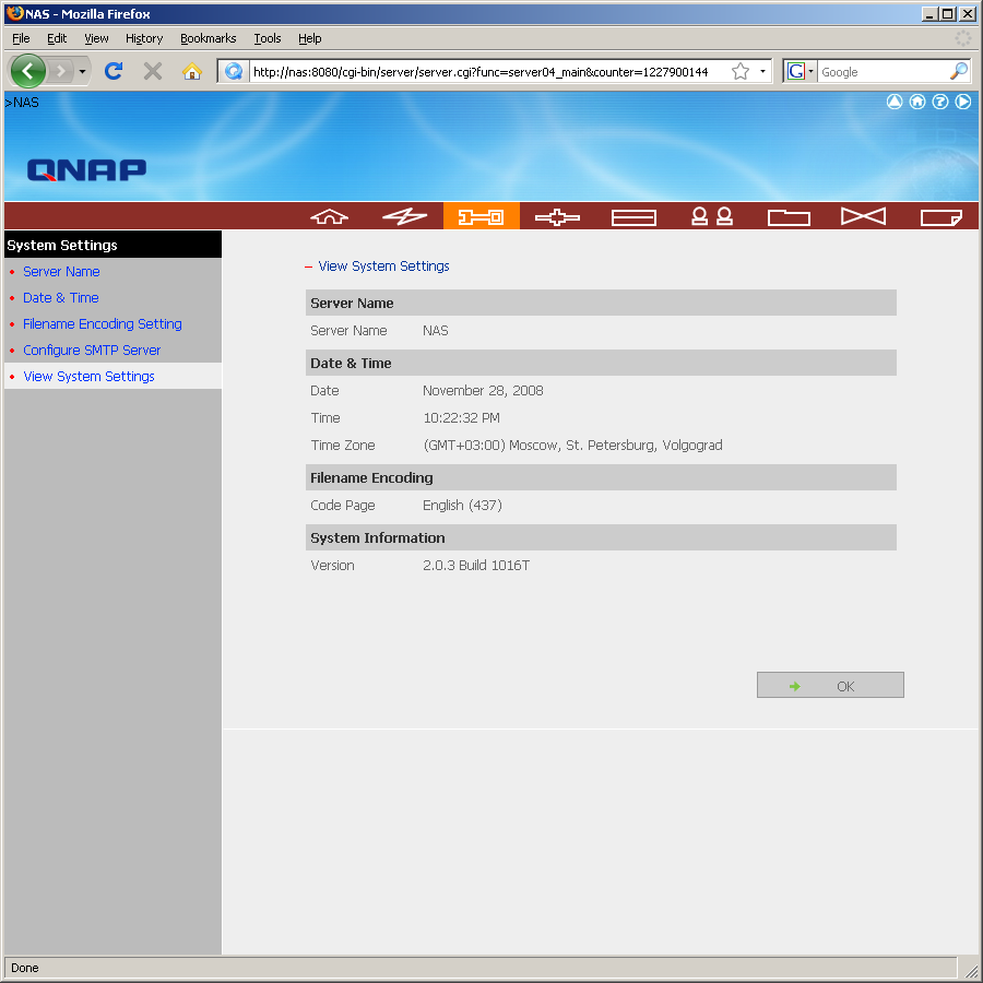 Второй раздел — параметры системы. Здесь задается имя сервера (по-умолчанию «NAS» плюс три последних байта первого MAC-адреса), дата/время (поддерживается синхронизация через Интернет), кодировка имен файлов (для клиентов, не поддерживающих Unicode), SMTP сервер для отправки сообщений (поддерживается авторизация и шифрование).