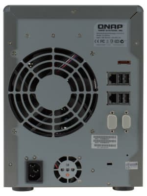Все остальные интересные элементы находятся сзади. Здесь можно найти — решетку основного вентилятора, порт eSATA, четыре порта USB, два гигабитных сетевых порта, кнопку сброса настроек, вход блока питания и решетка его вентилятора, консольный порт RS-232 и «зарезервированный» DB-15, являющийся на самом деле портом VGA. В целом все выглядит качественно и монументально.