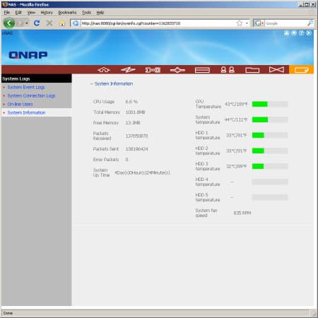 Наконец мы добрались до последней страницы Web-интерфейса. Она посвящена логам и системной информации. Файлов протоколов предусмотрено два — с событиями и с подключениями. Также здесь представлен список текущих пользователей и общая информация о системе — загрузка процессора, оперативной памяти, время работы накопителя, температуры жестких дисков и системы, скорость вращения вентилятора.