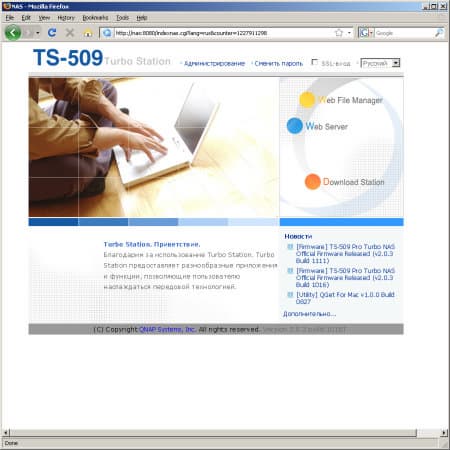 Как мы уже говорили, наличие экрана упрощает определение IP-адреса накопителя и доступ к нему через браузер не вызывает никаких сложностей. На первой странице Web-интерфейса представлены ссылки на вход администратора, активные сервисы (например управления файлами и сайты), некоторая информация о функциях устройства и новостная колонка с сайта Qnap (в частности в ней публикуется информация о новых прошивках). Также здесь можно найти меню выбора языка (есть и русский) и чек-бокс использования шифрованного соединения (SSL).