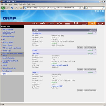 Как вы уже поняли, возможности рассматриваемой модели выходят далеко за рамки обычного сетевого накопителя. Но и этого производителю показалось мало и он включил в прошивку поддержку специально написанных модулей (QPKG). Сегодня среди них можно найти SABnzbd+, Python, WordPress, Joomla, phpMyAdmin, MLDonkey, SlimServer и даже Optware IPKG. Под последним скрывается автоматизированная система управления пакетами, в которой сегодня насчитываются уже сотни программ. Их подробное описание выходит за рамки данной статьи. Интересующимся посоветуем обратиться на Qnap WiKi.