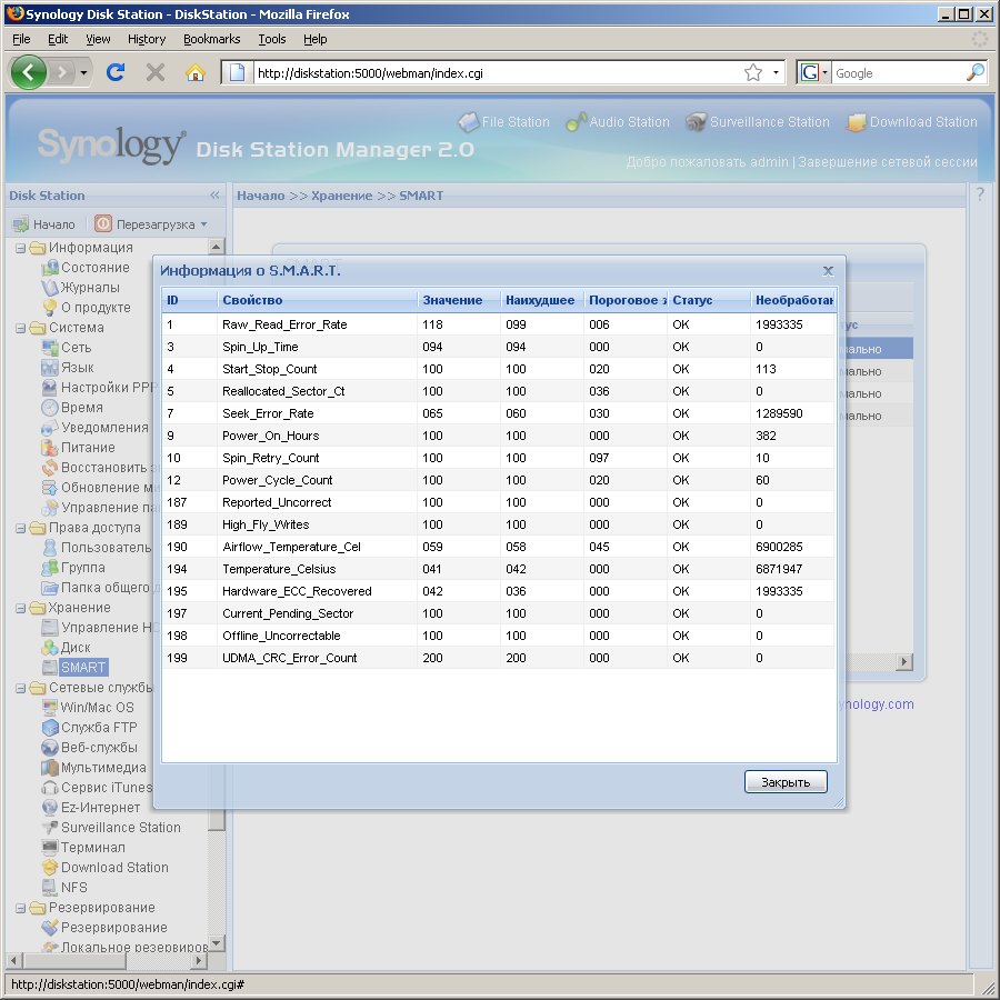 В группе «Хранение» находятся настройки дисковых томов и просмотр информации SMART. Тома можно создавать в любом количестве и сочетании, с ограничением только по числу дисков. Предусмотрено восстановление отказоустойчивых массивов и миграция на диски большего размера без потери информации. Также можно добавлять диски в некоторые типы массивов. Как и ранее, нет возможности установки для диска режима «запасной». Так что в случае отказа винчестера, пользователю придется самому активировать процесс восстановления. Кроме просмотра информации SMART можно также провести проверку дисков встроенными средствами. К сожалению, это касается только «железной» части, сканирование файловой структуры тома не предусмотрено.