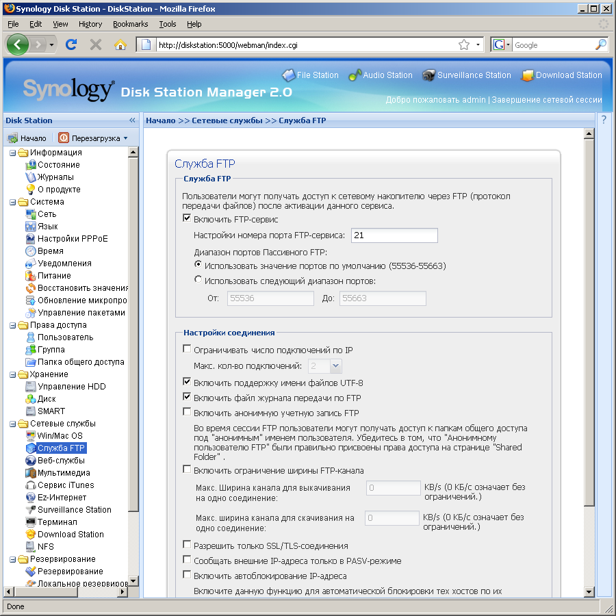 Самая многочисленная группа — это, конечно, «Сетевые службы». Именно здесь и настраивается непосредственно сетевое функционирование накопителя. Для сети Windows можно выбрать рабочую группу или включить накопитель в домен. Возможно использование сетевой корзины для удаленных файлов, что может быть очень актуально для некоторых пользователей. Особенно если учесть отсутствие данной функциональности в штатном клиенте Windows. Служба FTP у накопителей от Synology имеет, на наш взгляд, самую интересную реализацию из всех виденных. Настраивается практически все — порты (в том числе и для пассивного режима), количество подключений, скорости передачи данных, шифрование. Возможна блокировка доступа при обнаружении попытки подбора пароля. Для служб на базе Web можно включить поддержку шифрования и сделать его обязательным. Мультимедийные сервисы представлены UPnP AV/DLNA и iTunes. К сожалению, они работают только с предопределенными папками на накопителе (music, photo, video), что заметно снижает удобство использования. Доступ к накопителю по Telnet и SSH теперь можно включить через Web-интерфейс, без установки патчей. Аналогичное замечание касается и поддержки протокола NFS. На отдельных страницах можно активировать систему видеонаблюдения и станцию автономной загрузки файлов. Для последней можно указать время работы (один диапазон на все дни).