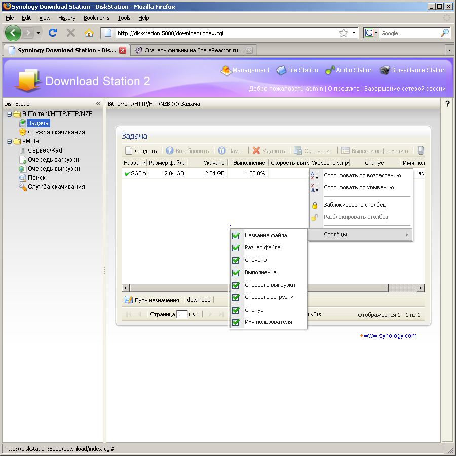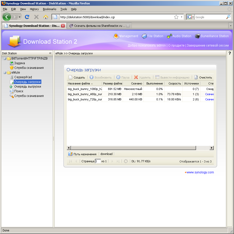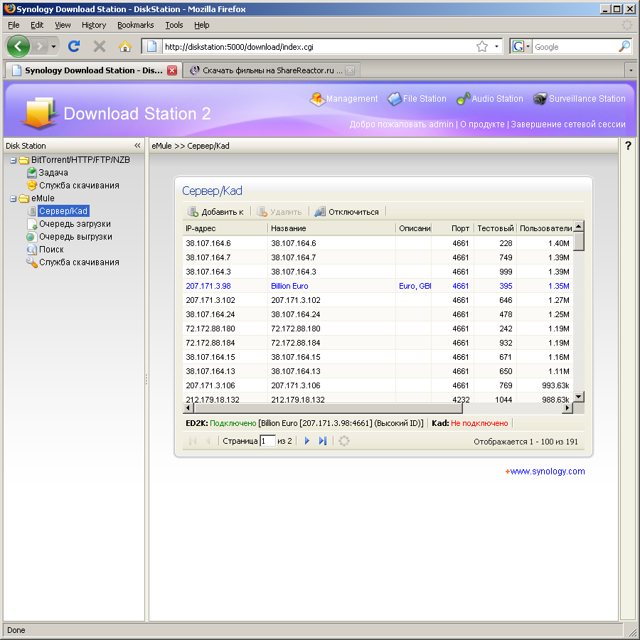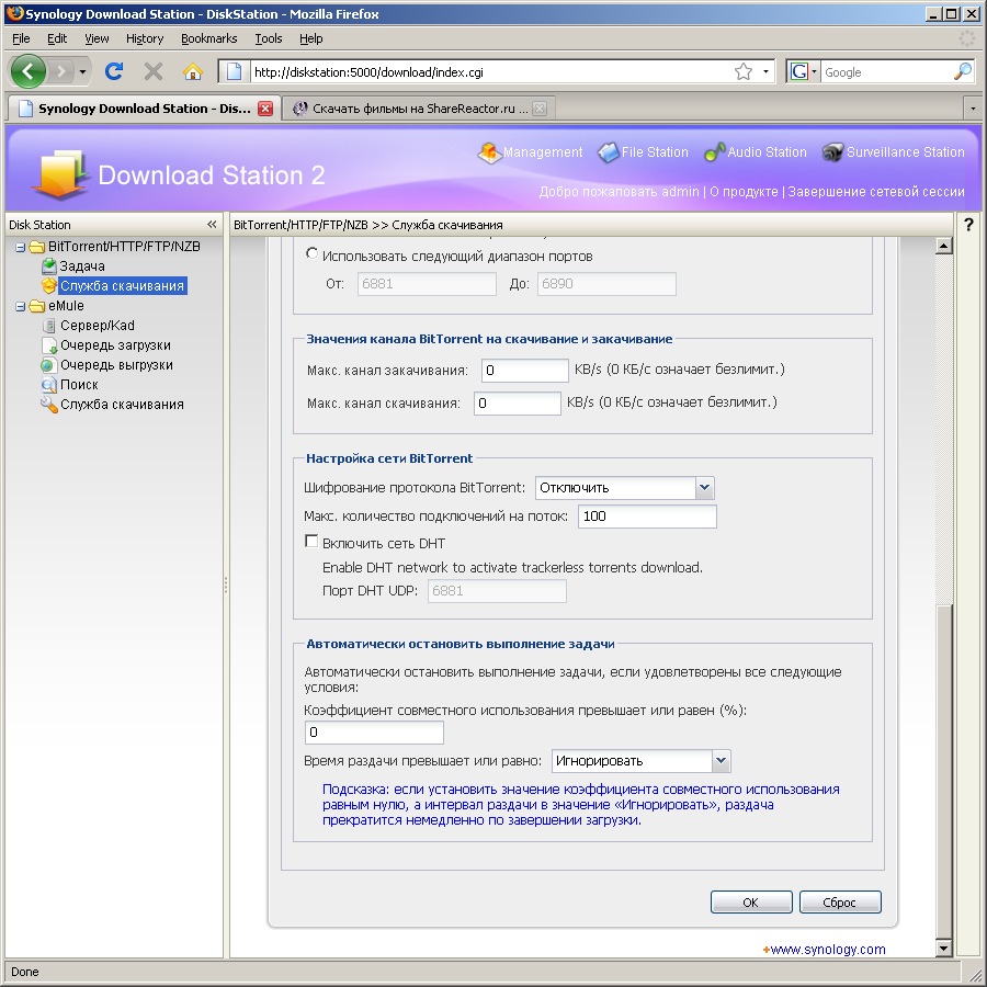 - Download Station — автономнаясистема загрузки файлов по протоколам FTP/HTTP/BitTorrent/eMule/NZB. Новая версия прошивки имеет отдельный мини-сайт для управления загрузками. На нем устанавливаются и параметры служб. Для FTP можно выбрать число одновременных подключений к одному серверу. Для BitTorrent — максимальное число активных задач (до 20), порт, ограничение скорости и числа коннектов, шифрование, параметры остановки задачи (время и/или рейтинг, позже их можно менять для каждой загрузки независимо). Возможен выбор отдельных файлов из торрента для загрузки. Кроме eMule поддерживается также Kad. Можно управлять списком серверов. Допускается только одно подключение к серверу. Предусмотрена встроенная функция поиска. На раздачу ставится все, что есть в целевой папке, например, скачанные торрентом файлы (если папки загрузки по этим протоколам совпадают). Данная опция реализована очень качественно. Конечно, до настольного компьютера ей далеко, однако большинство стандартных функций она выполняет. Протокол NZB используется для загрузки файлов из конференций Usenet по сходному с BitTorrent принципу. Скриншоты настройки и работы сервиса: 1, 2, 3, 4;