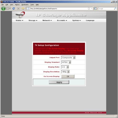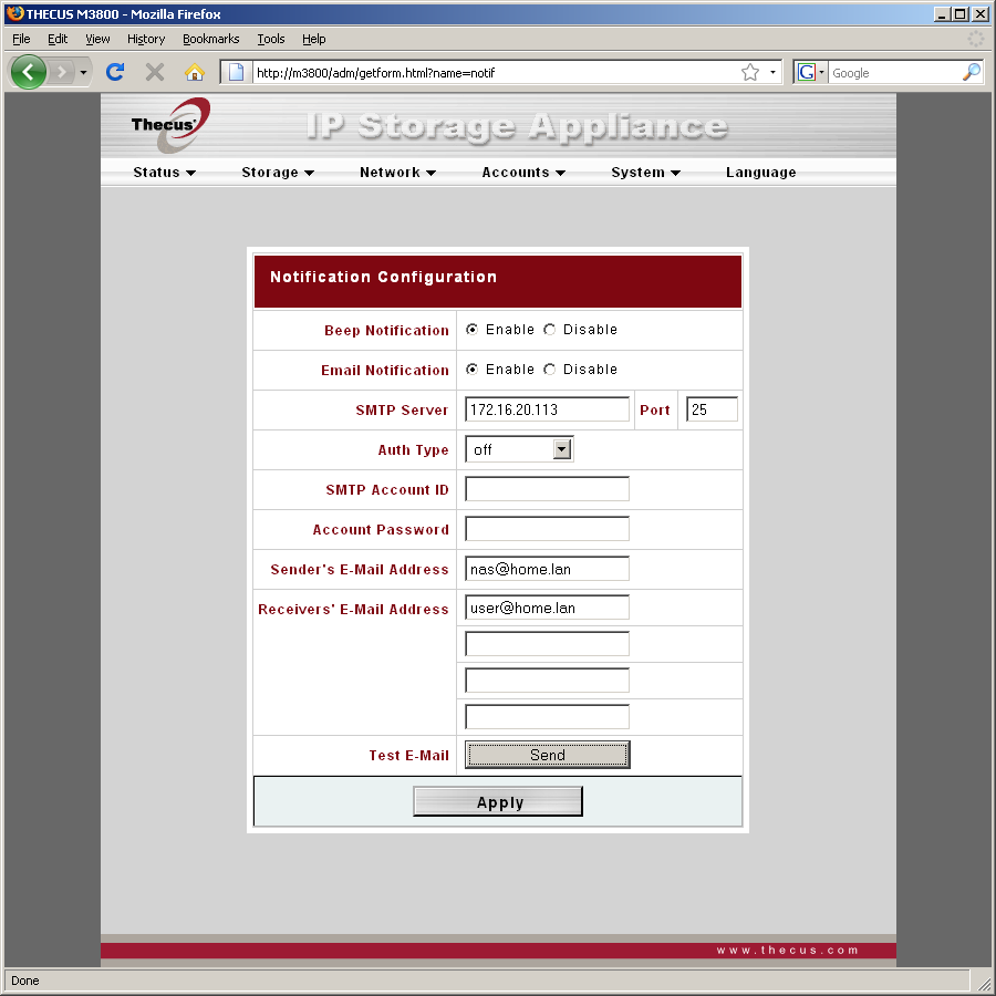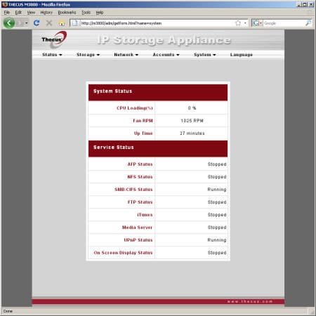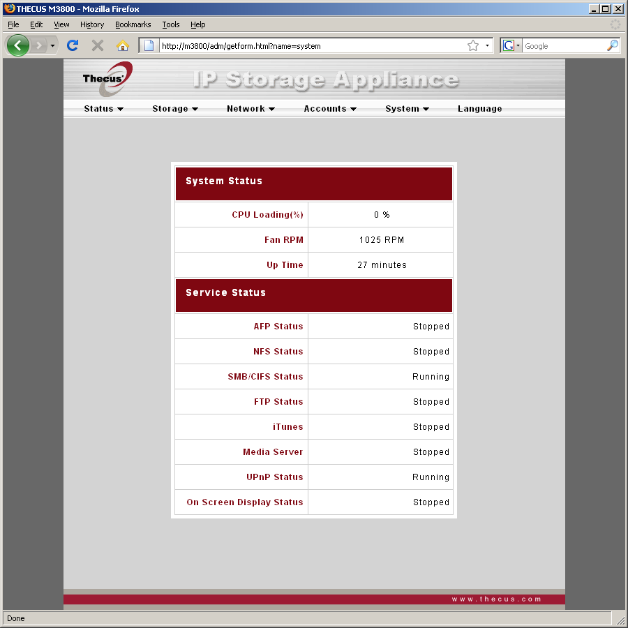 Система меню администратора организована в пять основных групп — «Status», «Storage», «Network», «Accounts», «System». Еще один пункт, доступный на любой странице — «Language», служит для смены языка интерфейса.