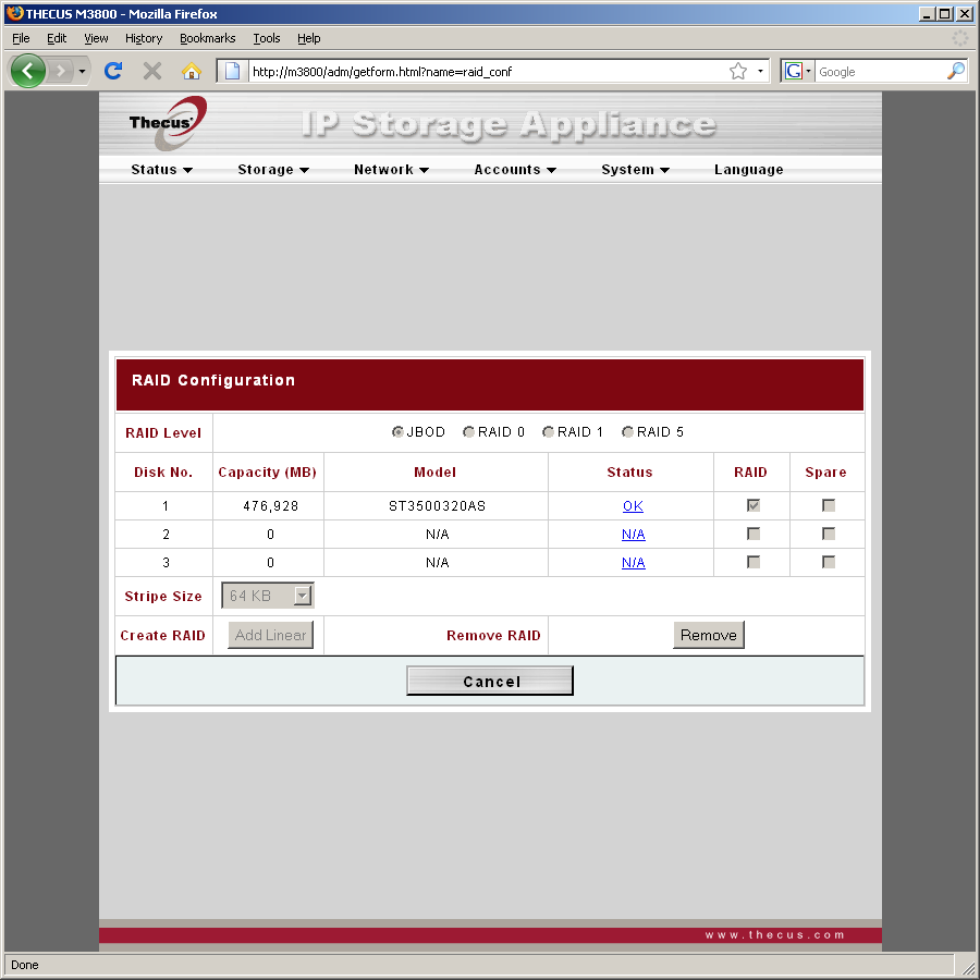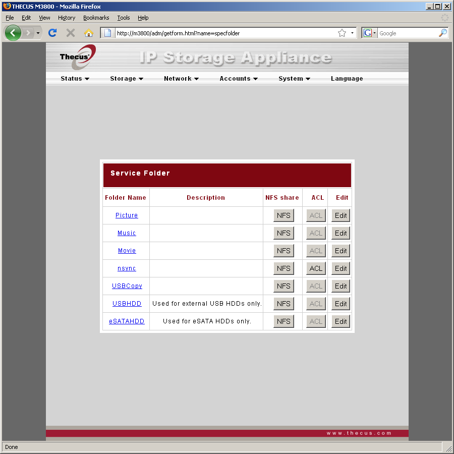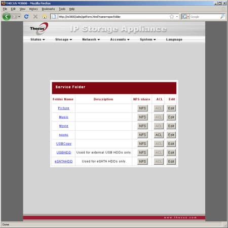«Storage» используется для просмотра статуса дисков (включая SMART), создания массивов (допускается иметь только один, возможны некоторые варианты по расширению без потери данных), управления общими папками и правами. Присутствует редкая возможность выбора размера блока для массивов — от 4 КБ до 4 МБ. Для каждой папки можно установить права на доступ по SMB/FTP (чтение, запись, нет доступа) для пользователей и/или групп. При работе с NFS также задаются списки систем с указанием режима доступа к ресурсу.
